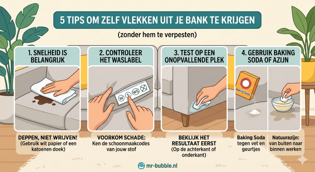Voordat je de vlek erger maakt of de stof van je bank definitief beschadigt, is het belangrijk om rustig te blijven. Een ongelukje hoeft namelijk niet het einde van je meubelstuk te betekenen. Met de juiste aanpak en een paar simpele huis-tuin-en-keukenmiddeltjes kom je vaak al een heel eind.